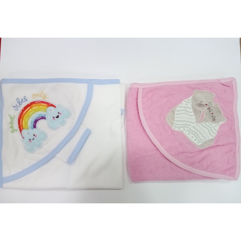 Για τη καθημερινή φροντίδα του μωρού σας σας προτείνουμε τη μπουρνουζοπετσέτα με κουκούλα και το πανάκι μπάνιου σε διάφορα χρώματα κ σχέδια. Το σετ είναι φτιαγμένο από βαμβάκι υψηλής ποιότητας που εξασφαλίζει απορροφητικότητα κ ανθεκτικότητα