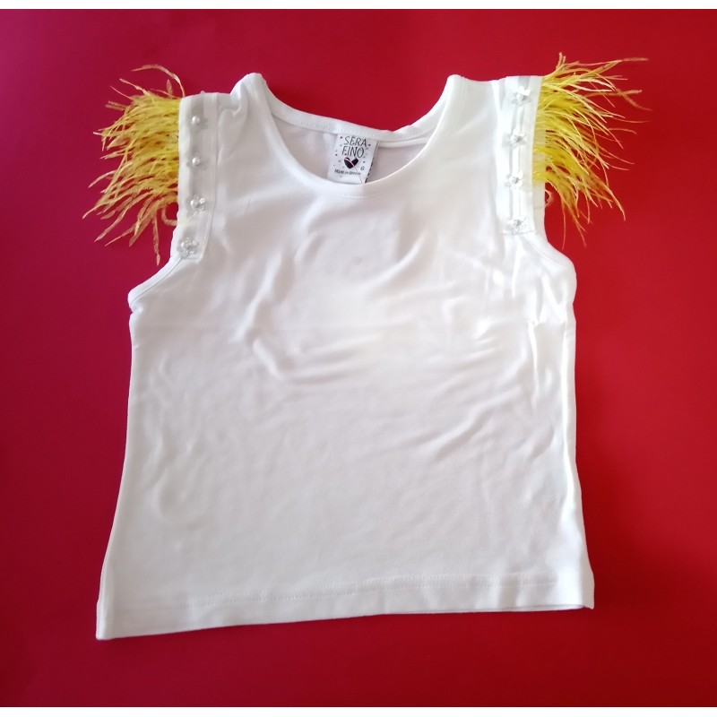 Ομορφο αμάνικο μπλουζάκι από μαλακό βαμβακερό ύφασμα και διακοσμητική τρέσα με κρόσια μπροστά .